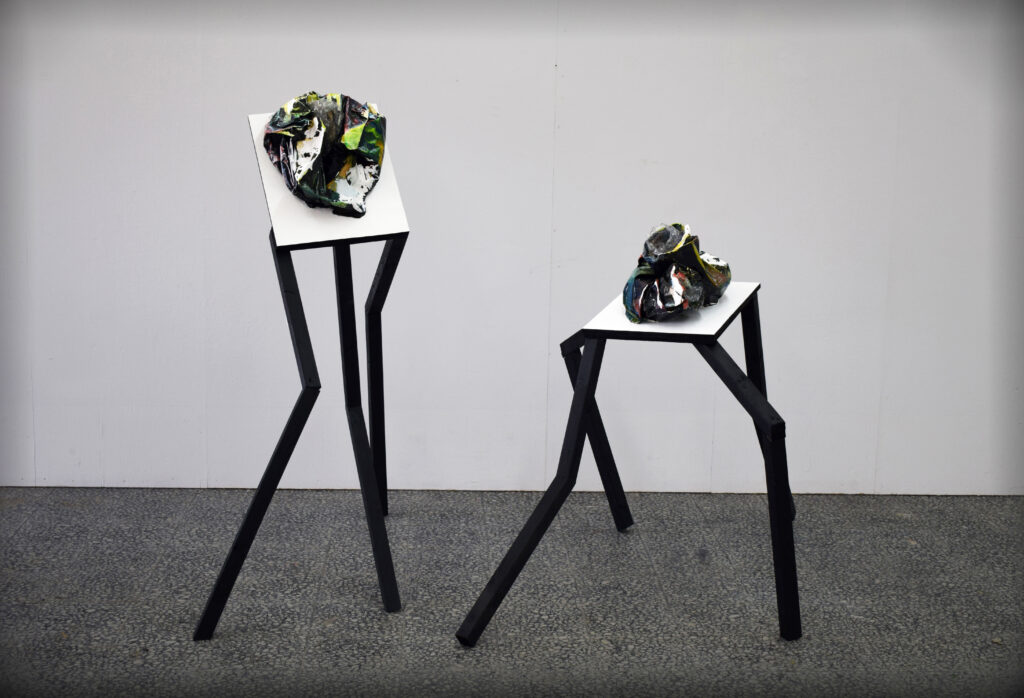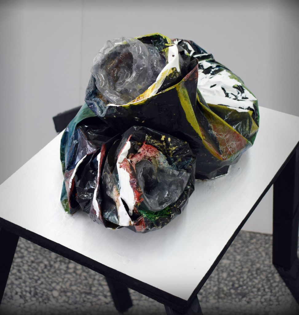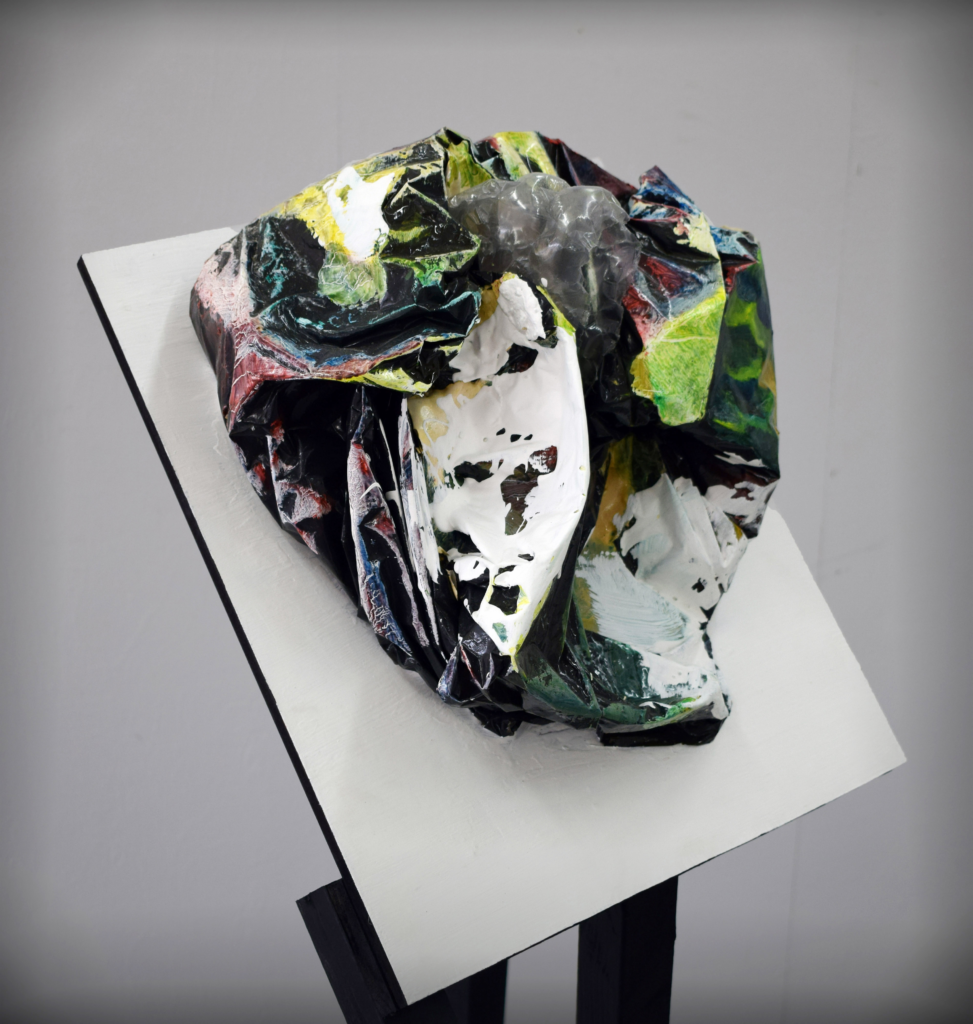(plastic bag, bubble wrap, shellac, paint, plaster, wood)