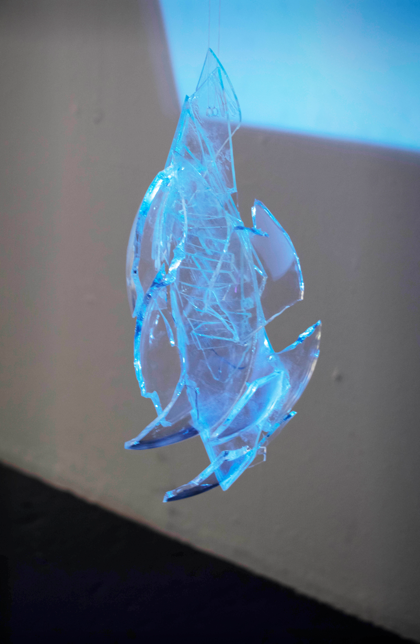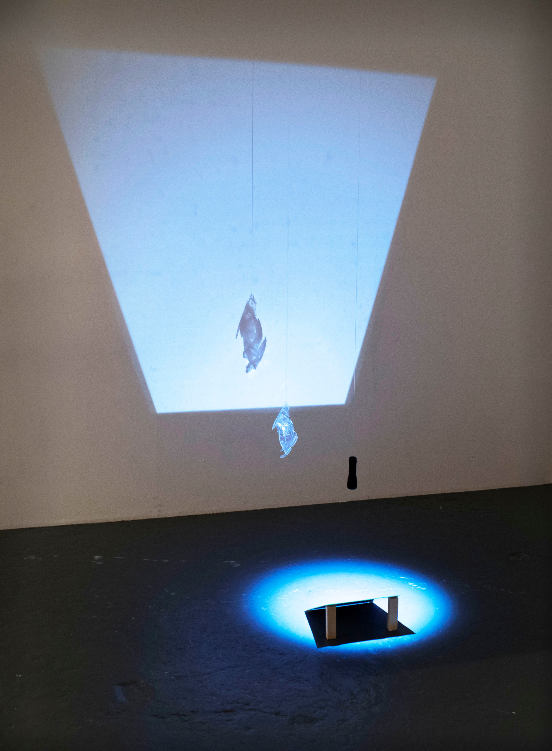 (broken glass, glue, flashlight, mirror, wall, shadow)